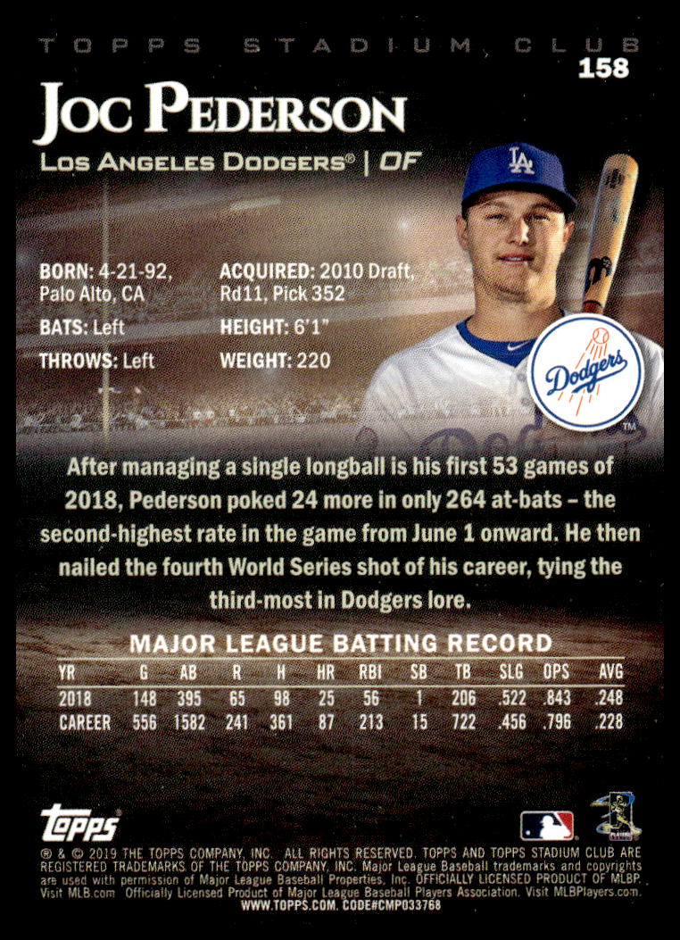 This BaseballΒ card, from 2019 is part of the Topps Stadium ClubΒ card set. Joc Pederson is featured and has a card number of 158.