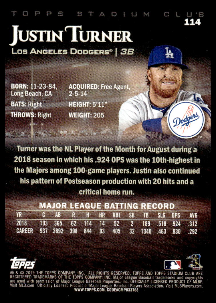 This BaseballΒ card, from 2019 is part of the Topps Stadium ClubΒ card set. Justin Turner is featured and has a card number of 114.