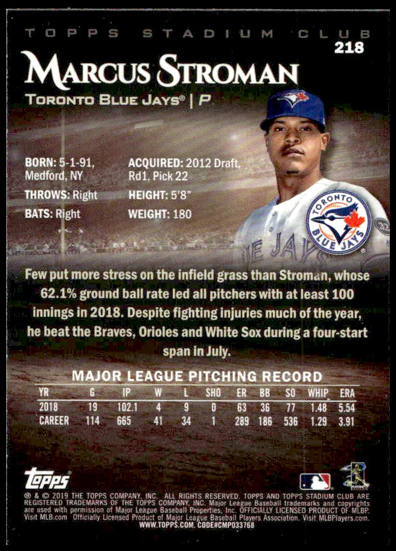 This Baseball card, from 2019 is part of the Topps Stadium Club card set. Marcus Stroman is featured and has a card number of 218.