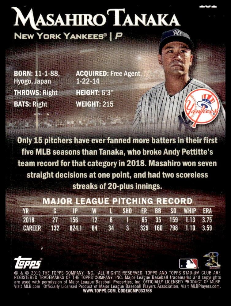 This Baseball card, from 2019 is part of the Topps Stadium Club card set. Masahiro Tanaka is featured and has a card number of 181.
