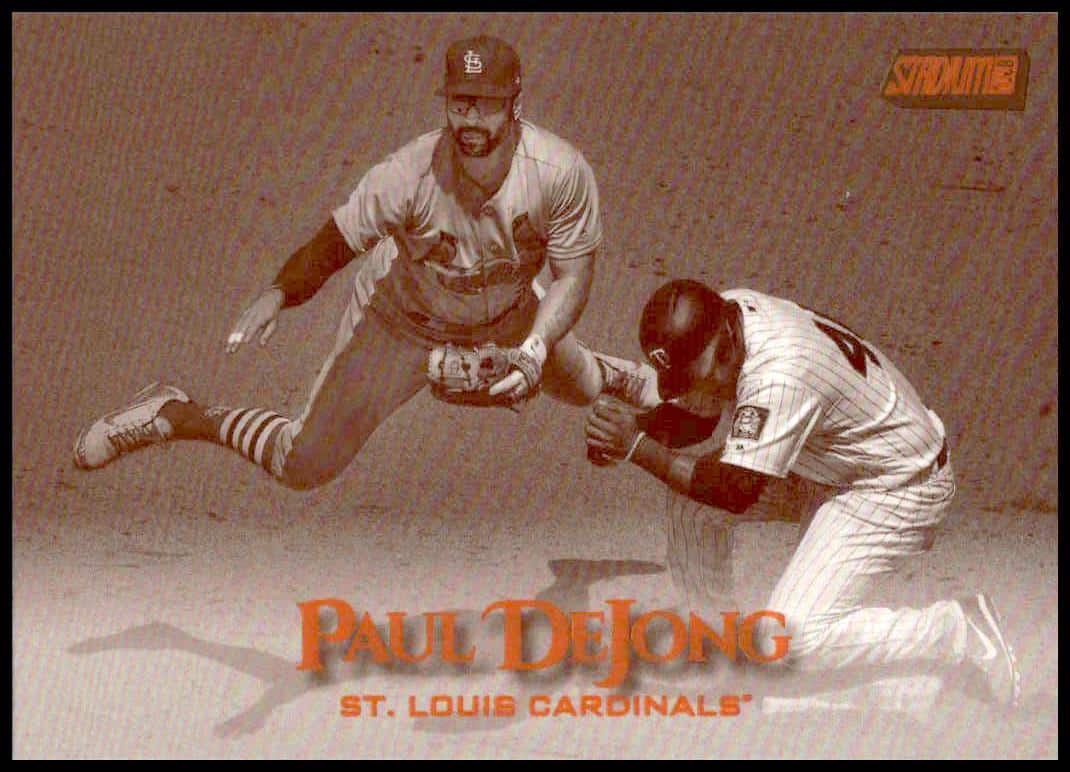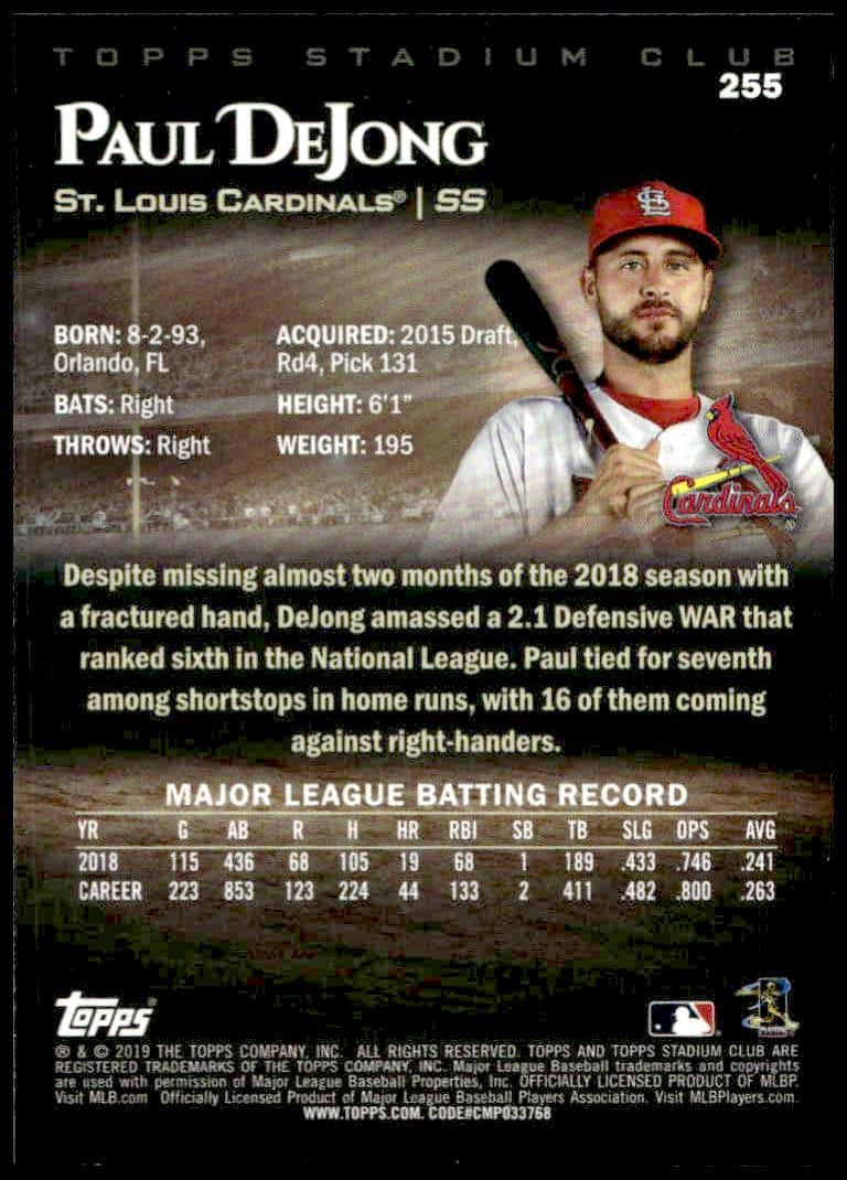This Baseball card, from 2019 is part of the Topps Stadium Club card set. Paul DeJong is featured and has a card number of 255.