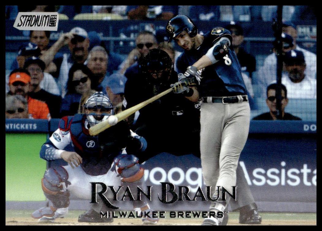 This Baseball card, from 2019 is part of the Topps Stadium Club card set. Ryan Braun is featured and has a card number of 136.