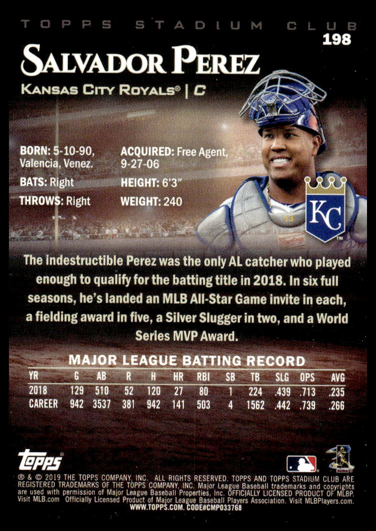 This BaseballΒ card, from 2019 is part of the Topps Stadium ClubΒ card set. Salvador Perez is featured and has a card number of 198.