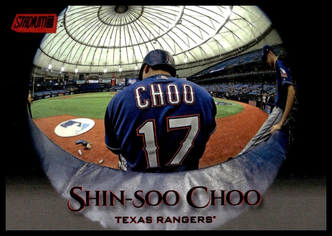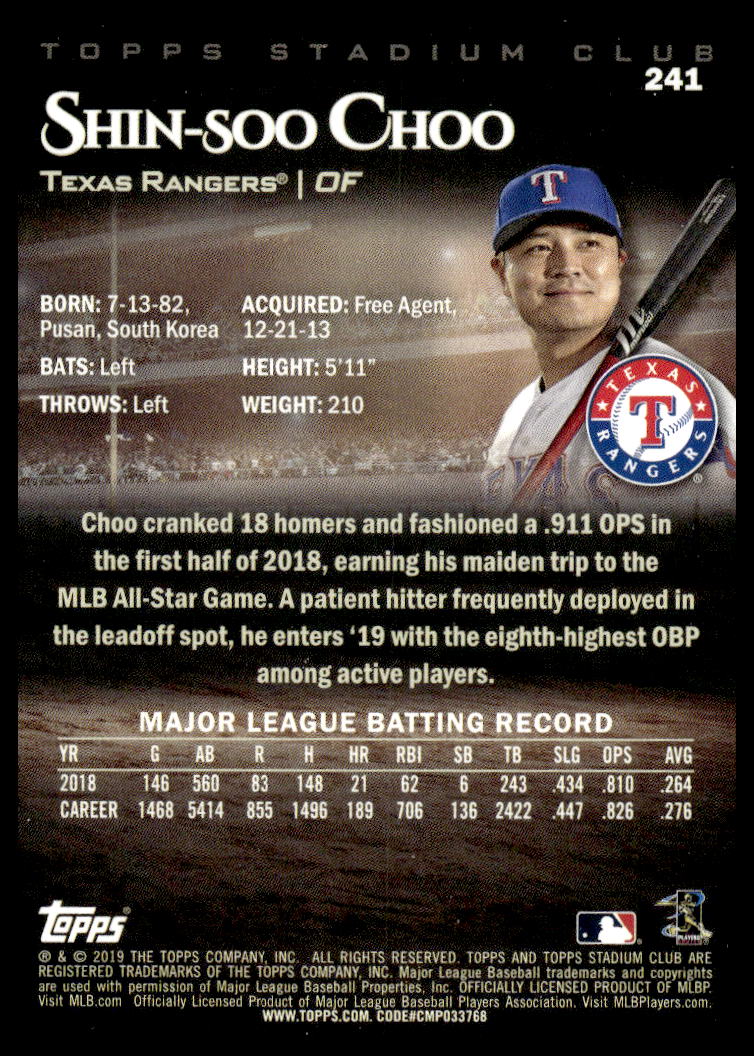 This BaseballΒ card, from 2019 is part of the Topps Stadium ClubΒ card set. Shin-Soo Choo is featured and has a card number of 241.