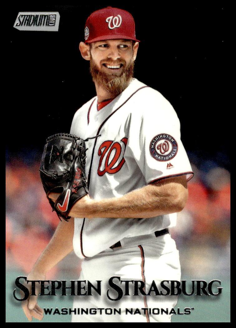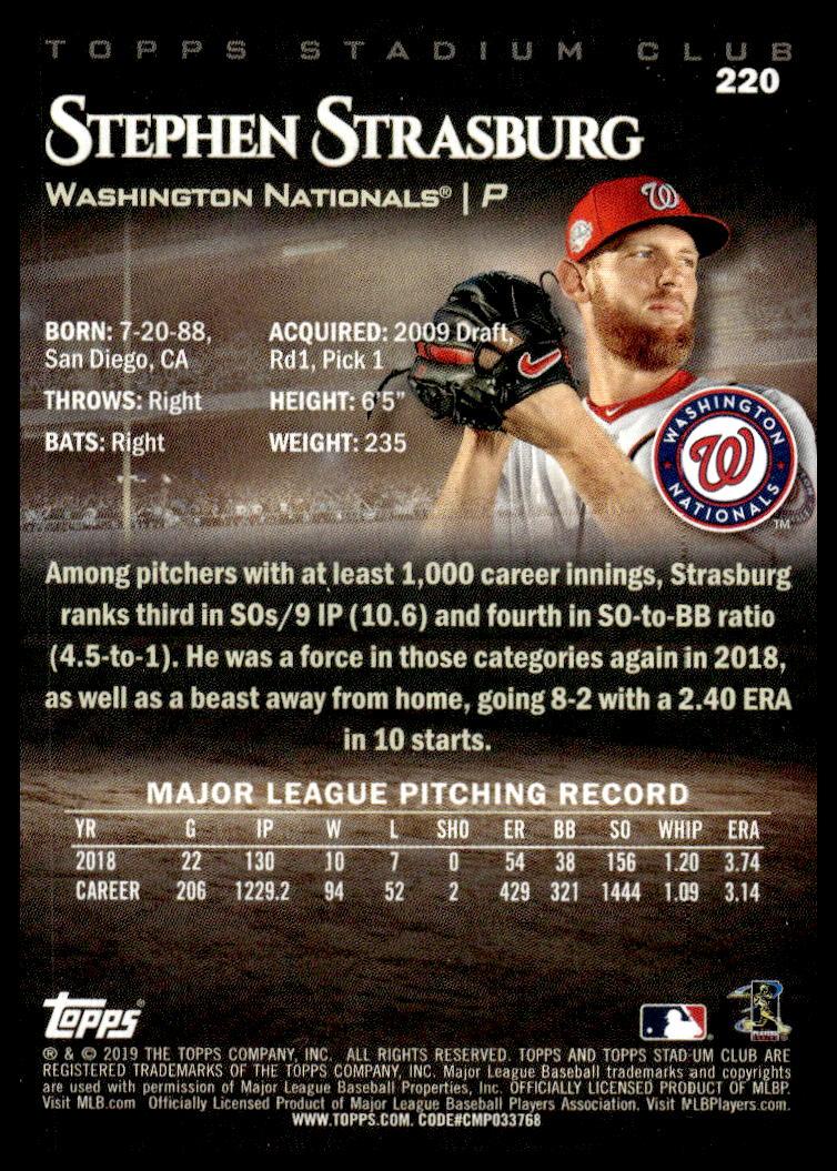 This Baseball card, from 2019 is part of the Topps Stadium Club card set. Stephen Strasburg is featured and has a card number of 220.