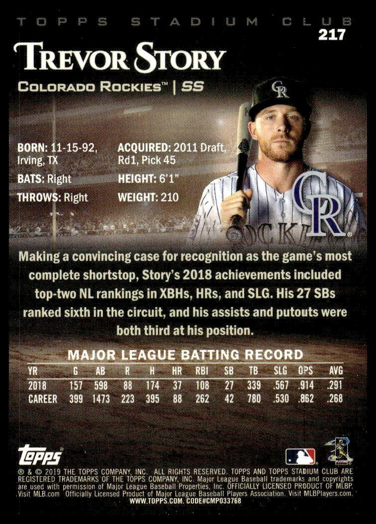 This BaseballΒ card, from 2019 is part of the Topps Stadium ClubΒ card set. Trevor Story is featured and has a card number of 217.