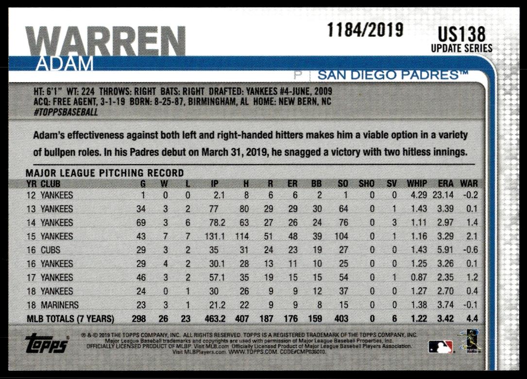This Baseball card, from 2019 is part of the Topps Update card set. Adam Warren is featured and has a card number of US138.