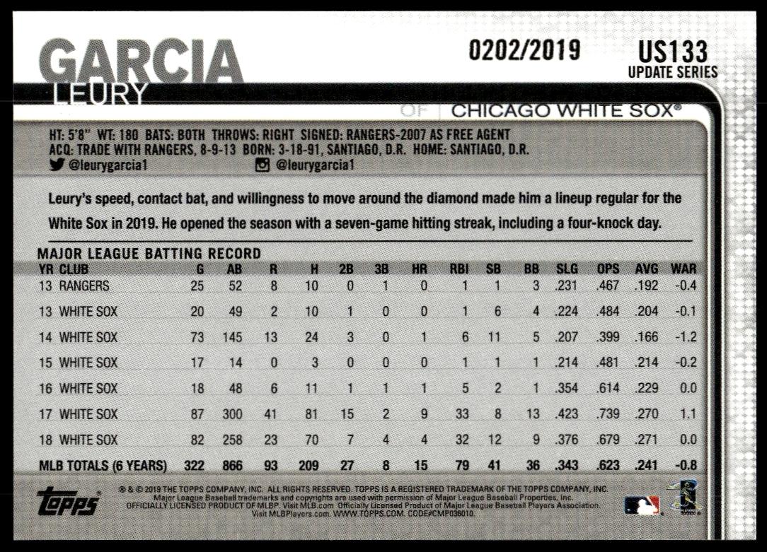 This BaseballΒ card, from 2019 is part of the Topps UpdateΒ card set. Leury Garcia is featured and has a card number of US133.