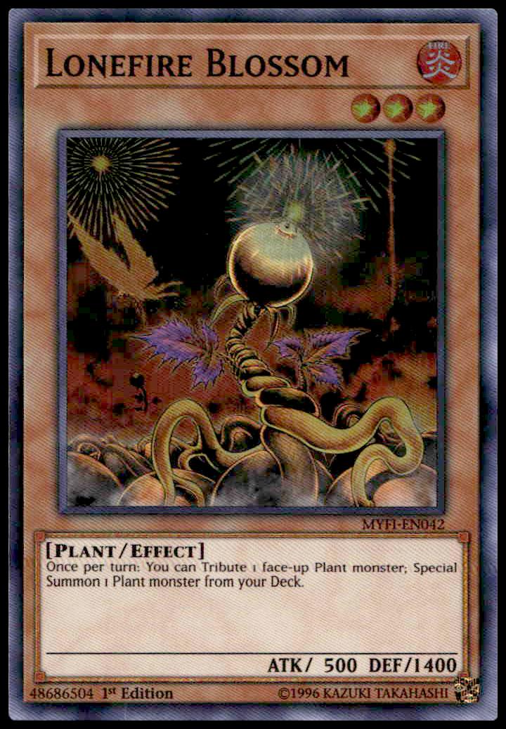 This Yu-Gi-OhΒ card, from 2019 is part of the Yu-Gi-Oh! Mystic FightersΒ card set. Lonefire Blossom is featured and has a card number of MYFI-EN042.