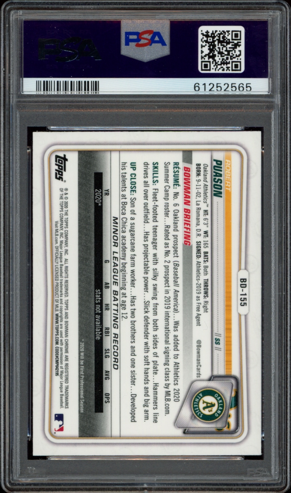 This Baseball card, from 2020 is part of the Bowman Draft card set. Robert Puason is featured and has a card number of BD-155. It is graded by PSA and has a numeric grade of 8.