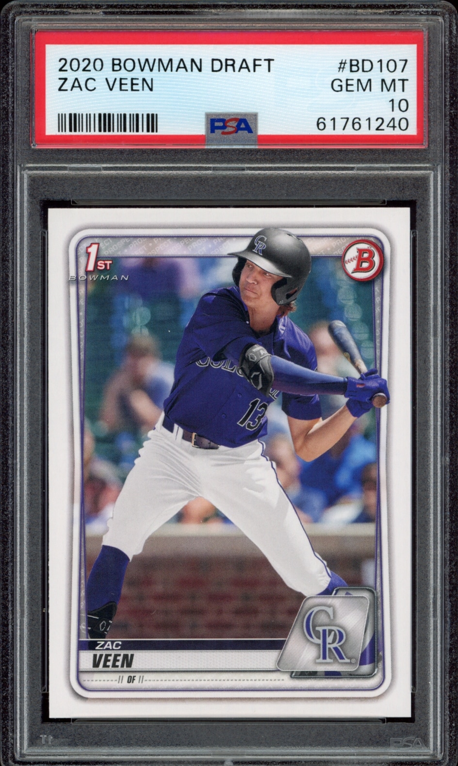2020 Bowman Draft Zac Veen #BD-107, graded PSA 10, is a pristine collectible card perfect for any baseball fan or serious collector.