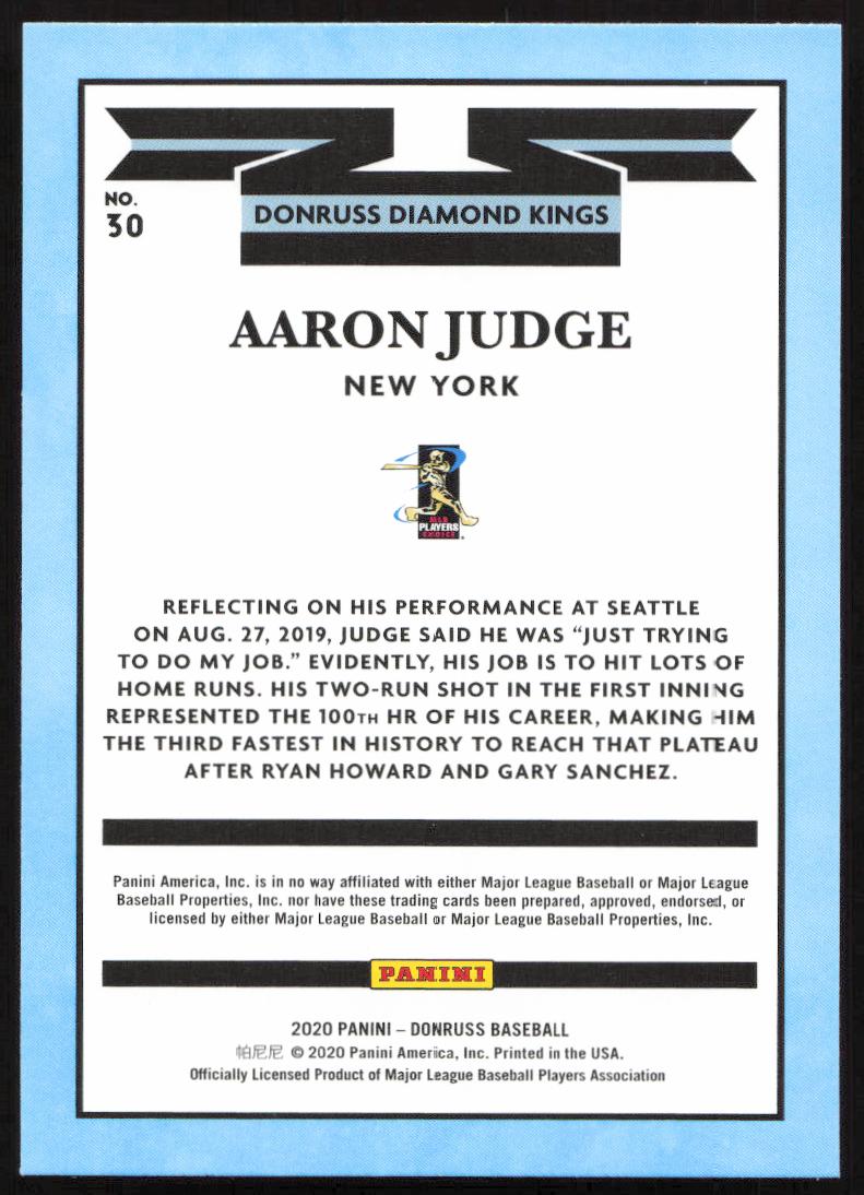 This Baseball card, from 2020 is part of the Donruss  card set. Aaron Judge is featured and has a card number of 30.