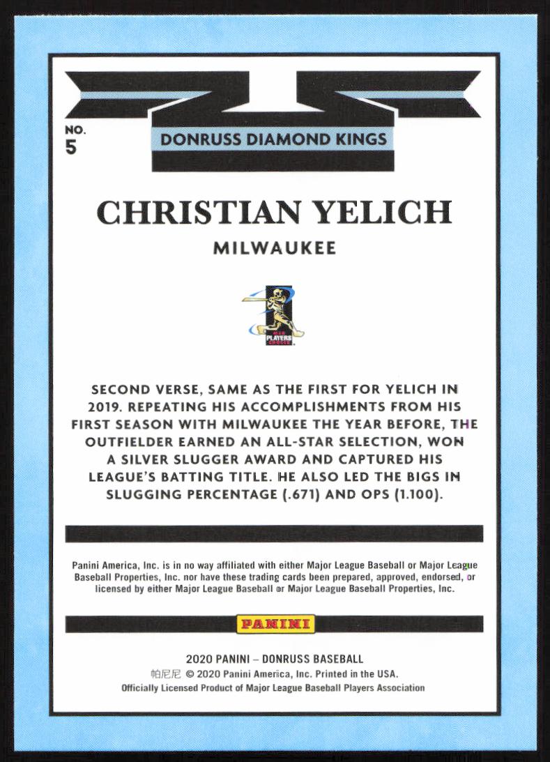 This Baseball card, from 2020 is part of the Donruss  card set. Christian Yelich is featured and has a card number of 5.