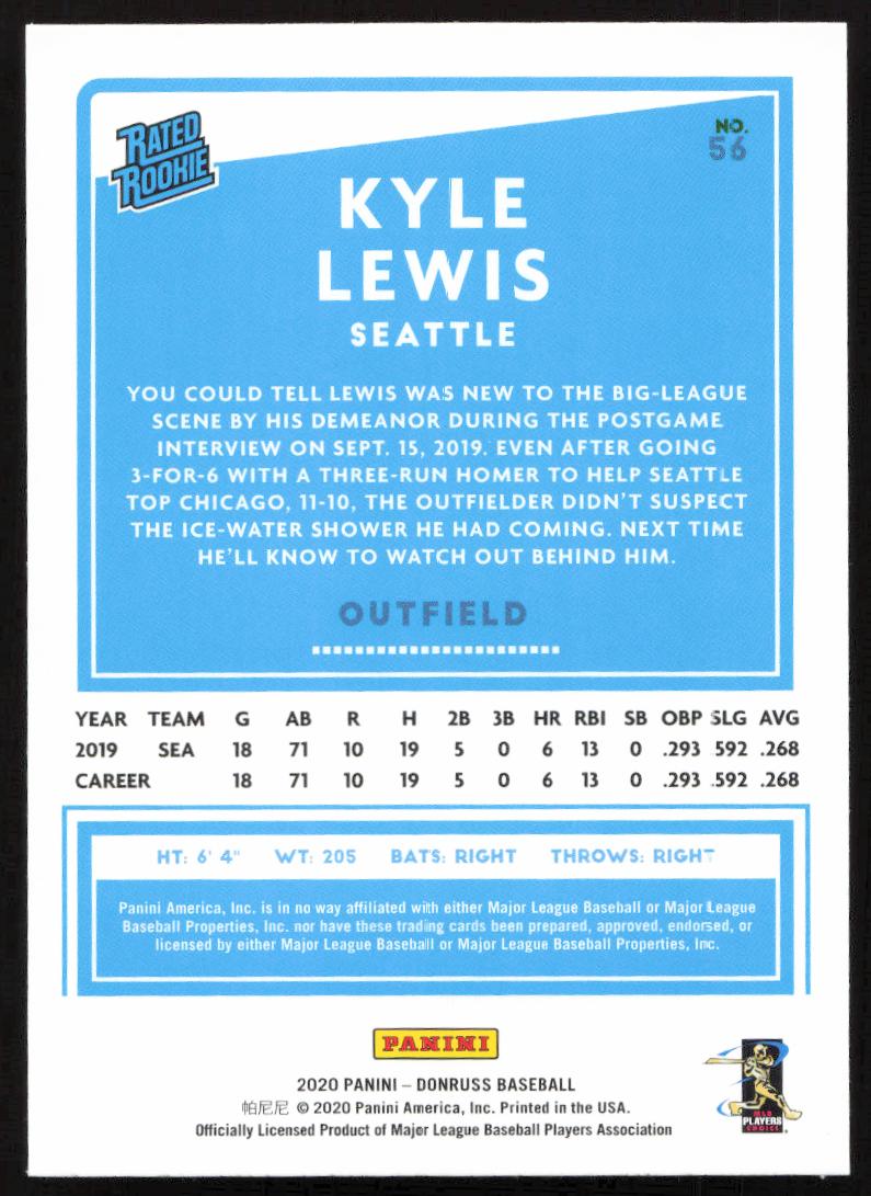 This Baseball card, from 2020 is part of the Donruss  card set. Kyle Lewis is featured and has a card number of 56.