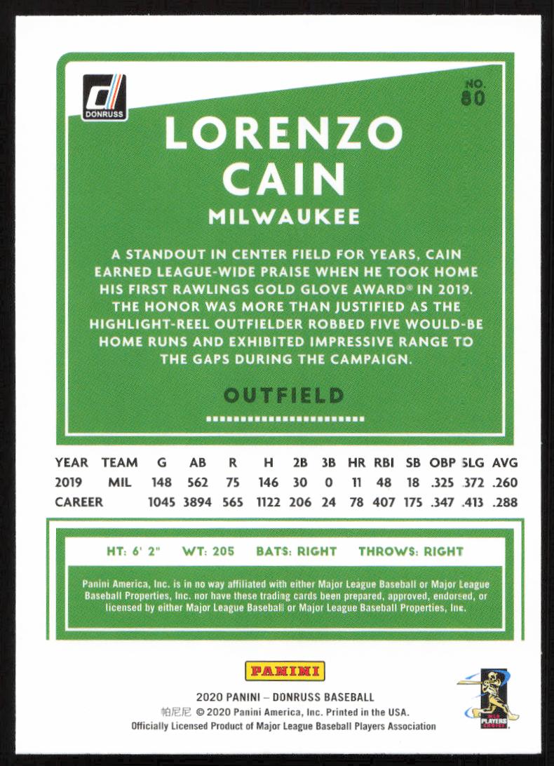 This Baseball card, from 2020 is part of the Donruss  card set. Lorenzo Cain is featured and has a card number of 80.