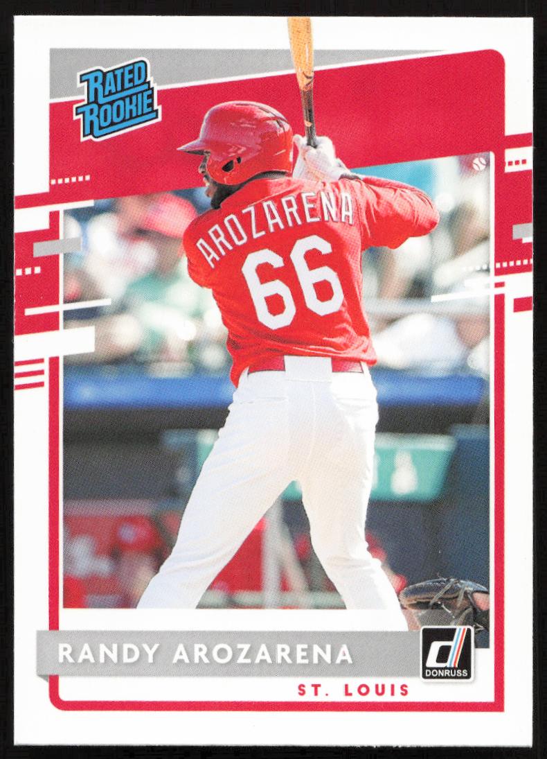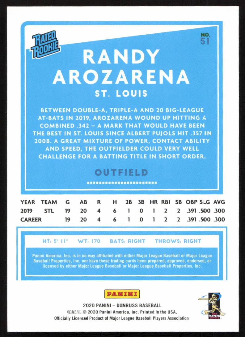 This Baseball card, from 2020 is part of the Donruss  card set. Randy Arozarena is featured and has a card number of 51.