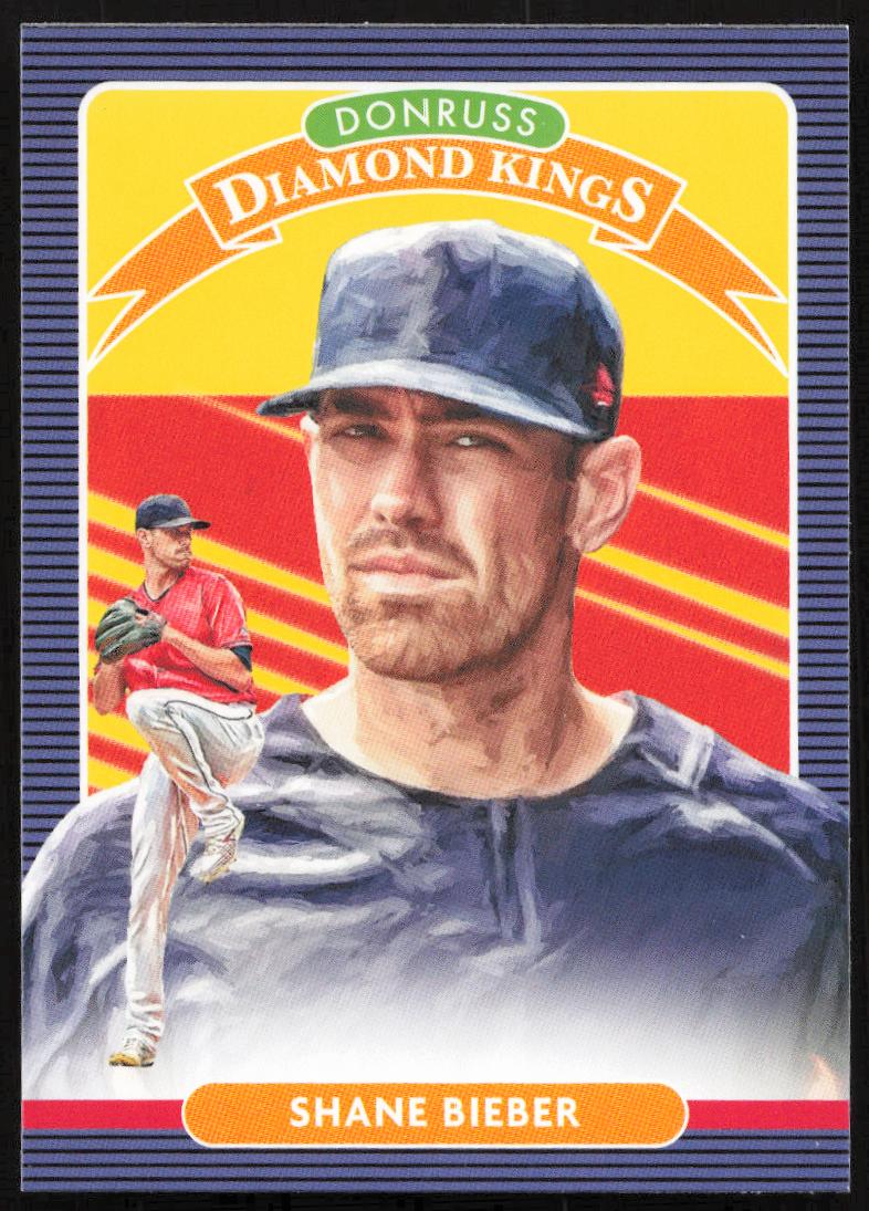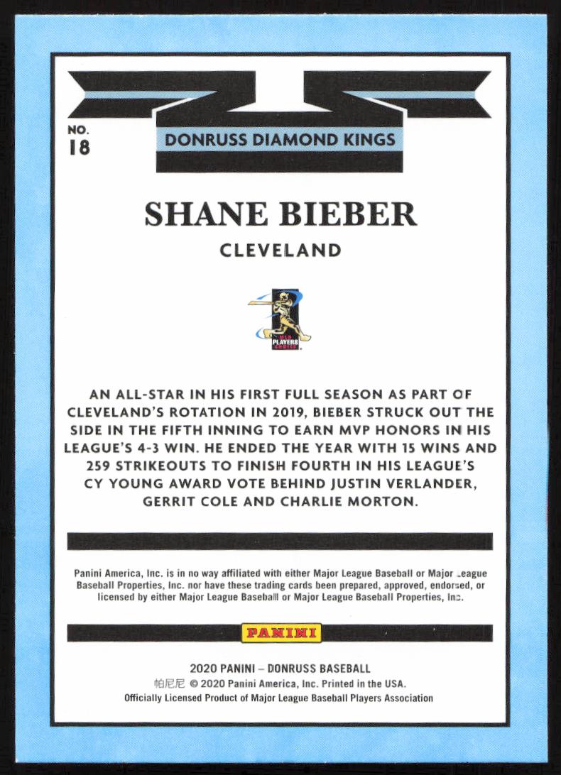 This Baseball card, from 2020 is part of the Donruss  card set. Shane Bieber is featured and has a card number of 18.