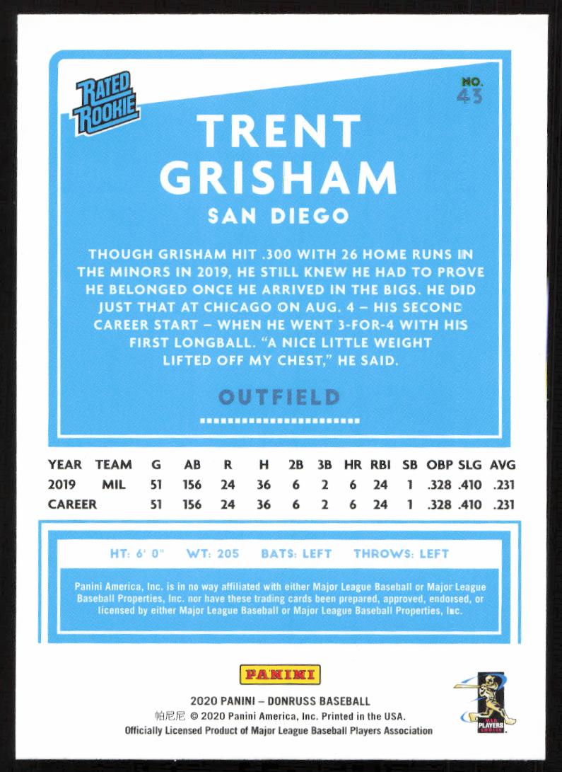This Baseball card, from 2020 is part of the Donruss  card set. Trent Grisham is featured and has a card number of 43.
