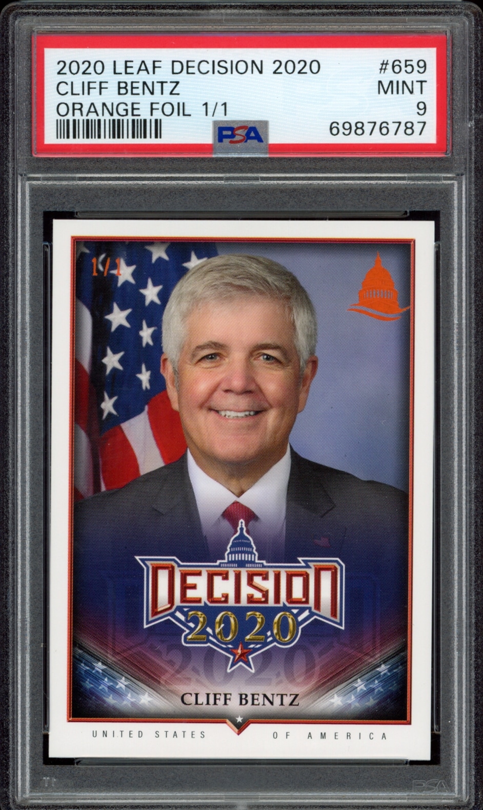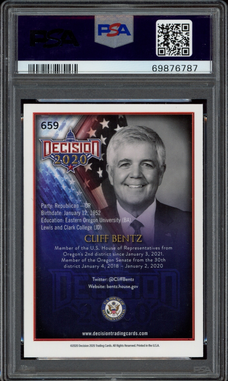 This Political card, from 2020 is part of the Leaf Decision card set. Cliff Bentz is featured and has a card number of 659. It is graded by PSA and has a numeric grade of 9.