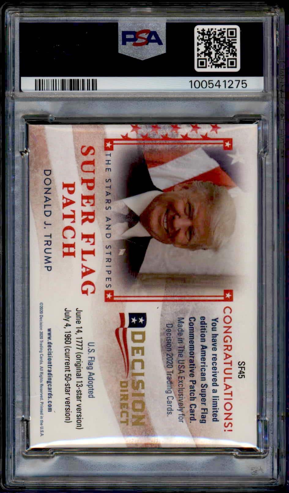 This Political card, from 2020 is part of the Leaf Decision Direct card set. Donald Trump is featured and has a card number of SF45. It is graded by PSA and has a numeric grade of 5.
