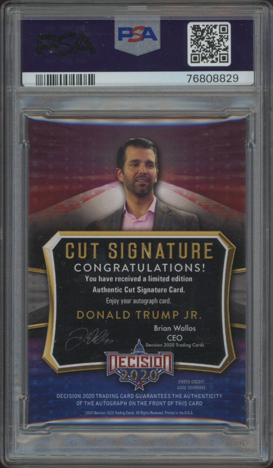 This Political card, from 2020 is part of the Leaf Decision card set. Donald Trump Jr. is featured and has a card number of . It is graded by PSA and has a numeric grade of 8.