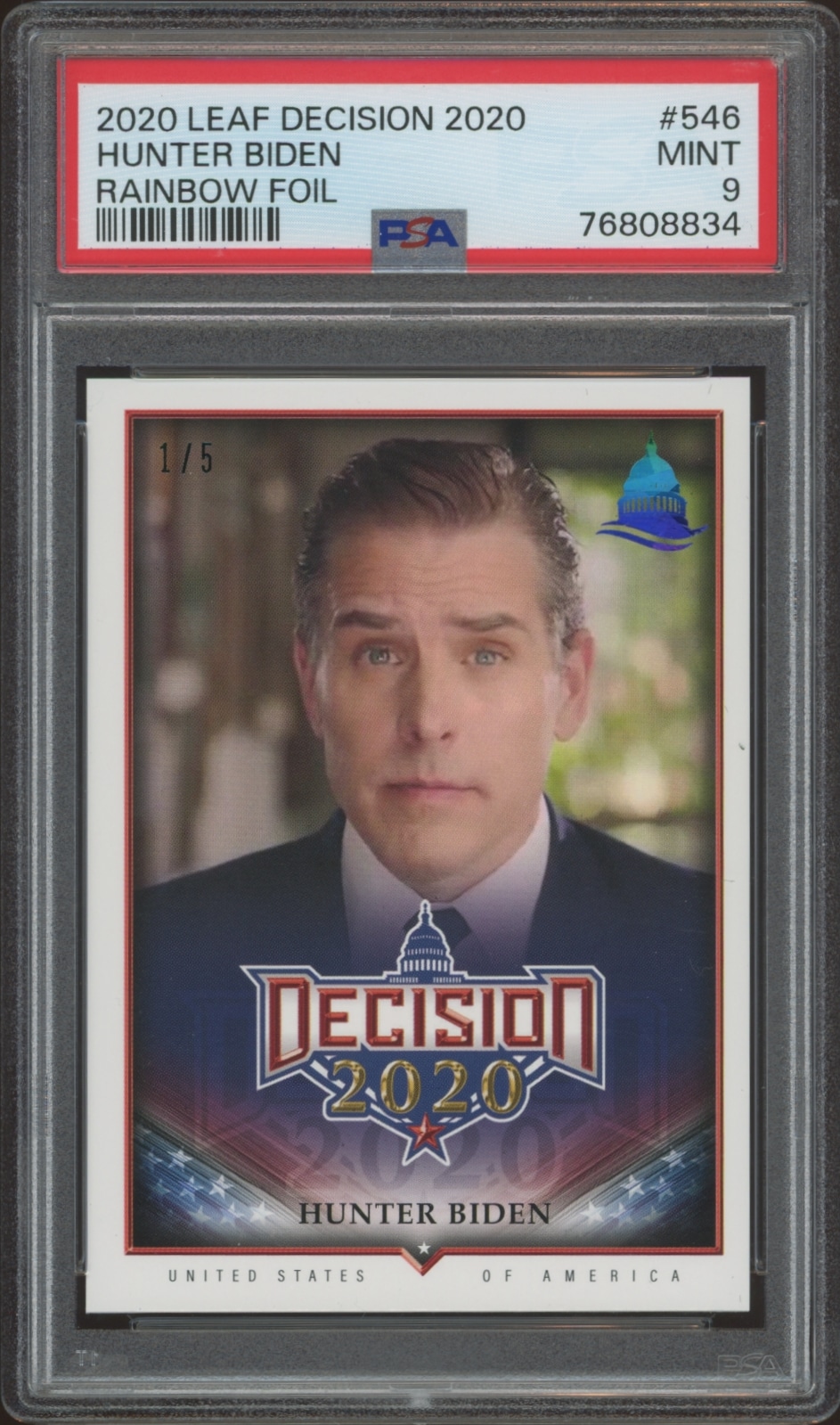 This Political card, from 2020 is part of the Leaf Decision card set. Hunter Biden is featured and has a card number of 546. It is graded by PSA and has a numeric grade of 9.