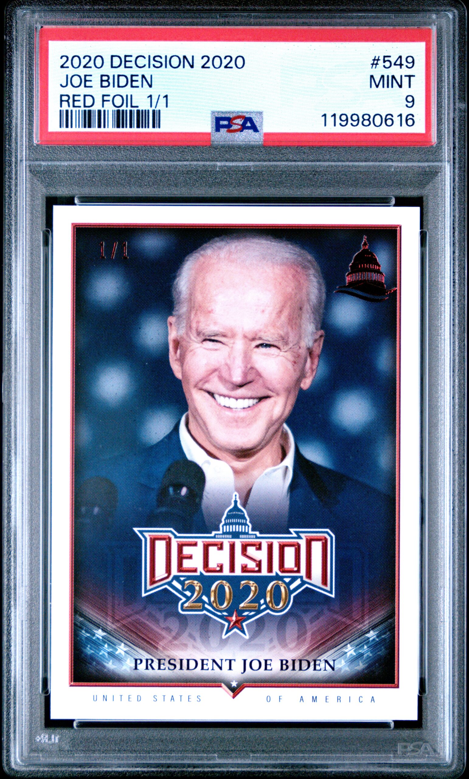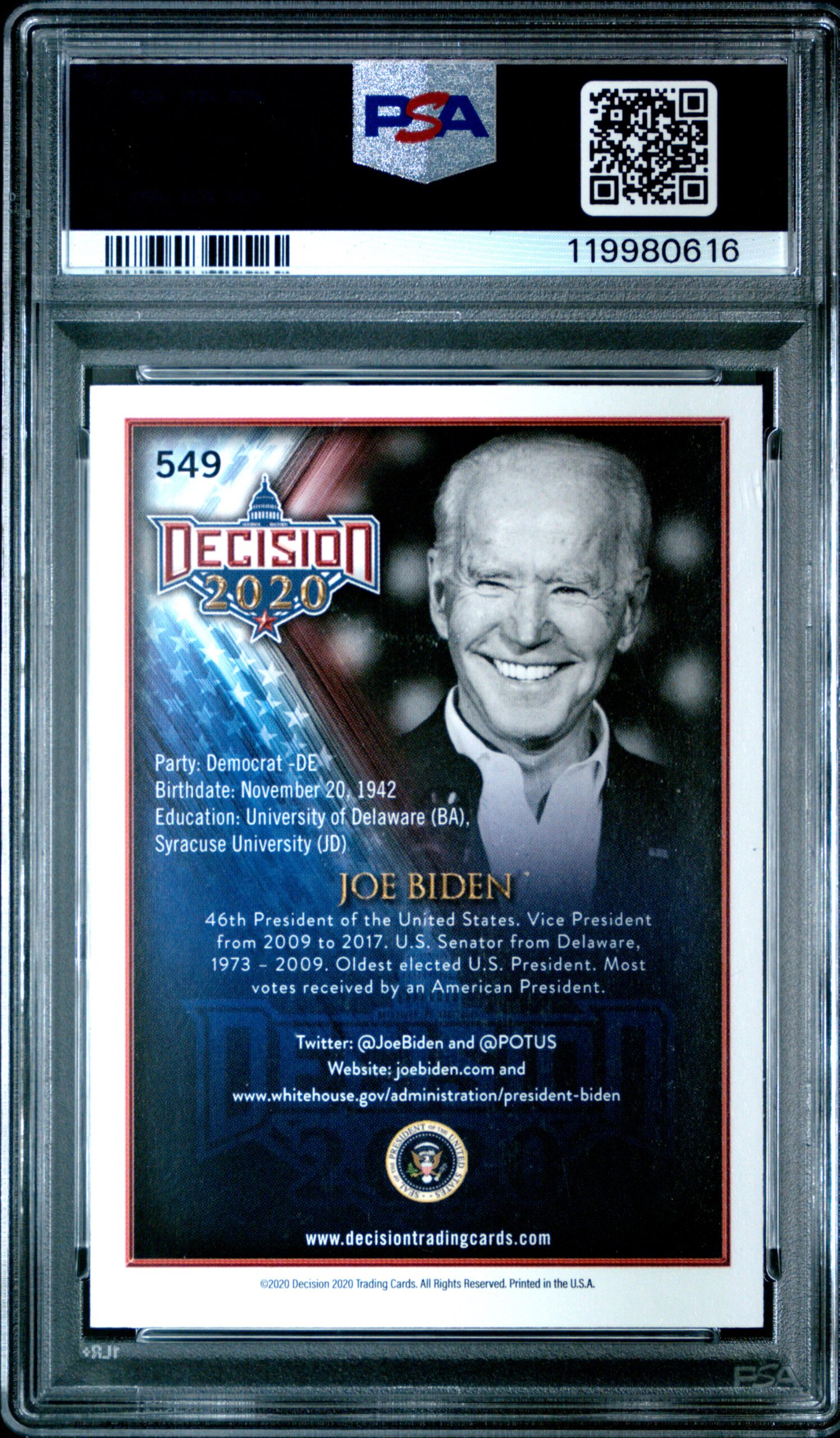 This Political card, from 2020 is part of the Leaf Decision card set. Joe Biden is featured and has a card number of 549. It is graded by PSA and has a numeric grade of 9.