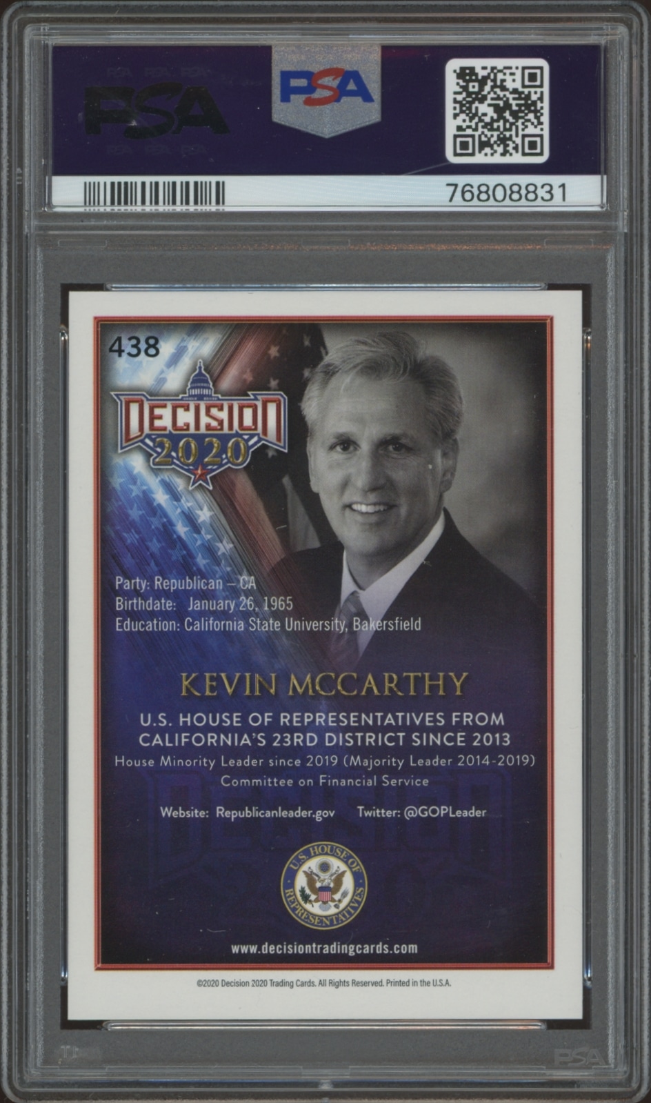 This Political card, from 2020 is part of the Leaf Decision card set. Kevin McCarthy is featured and has a card number of 438. It is graded by PSA and has a numeric grade of 9.