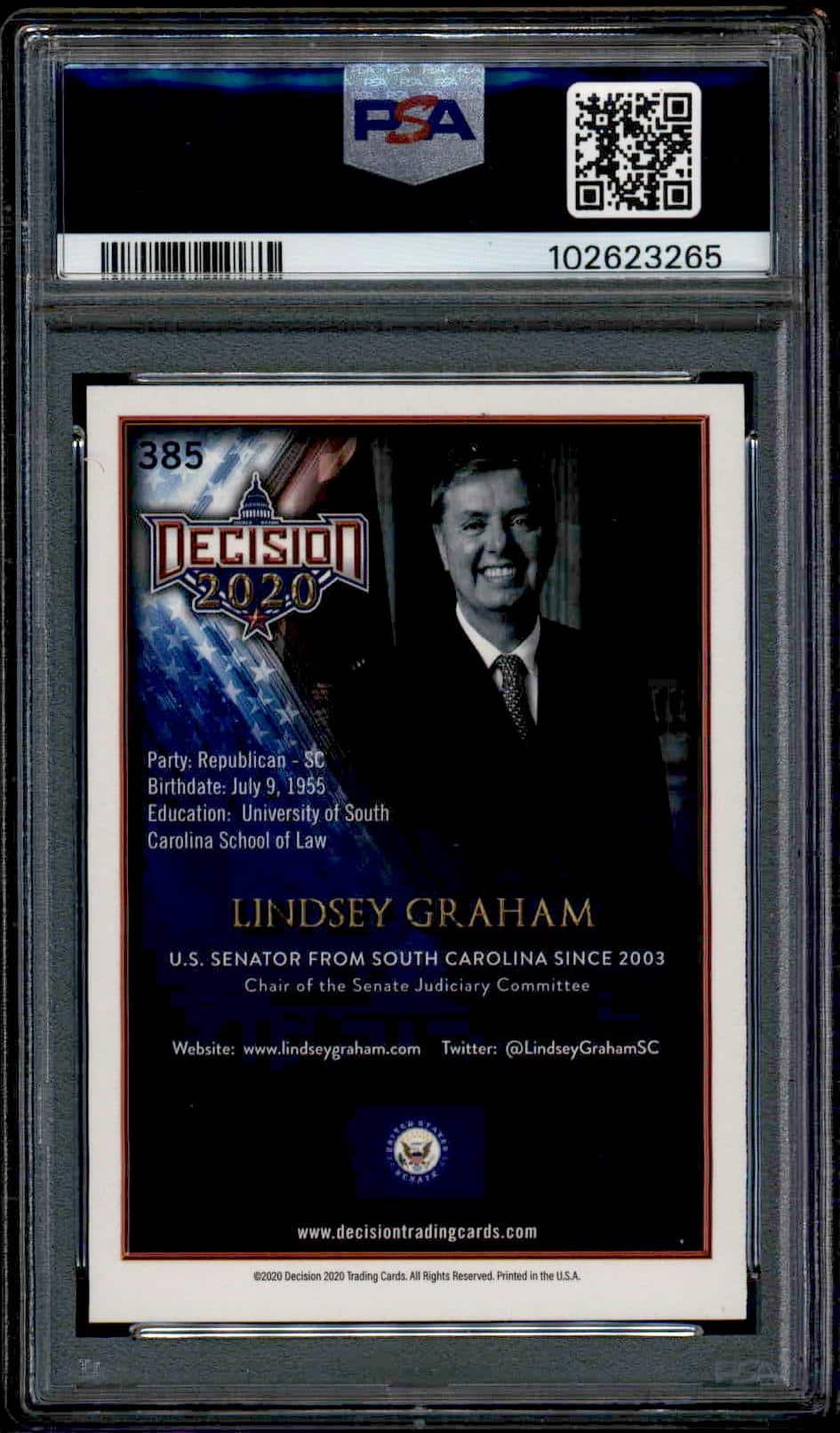 This Political card, from 2020 is part of the Leaf Decision card set. Lindsey Graham is featured and has a card number of 385. It is graded by PSA and has a numeric grade of 9.