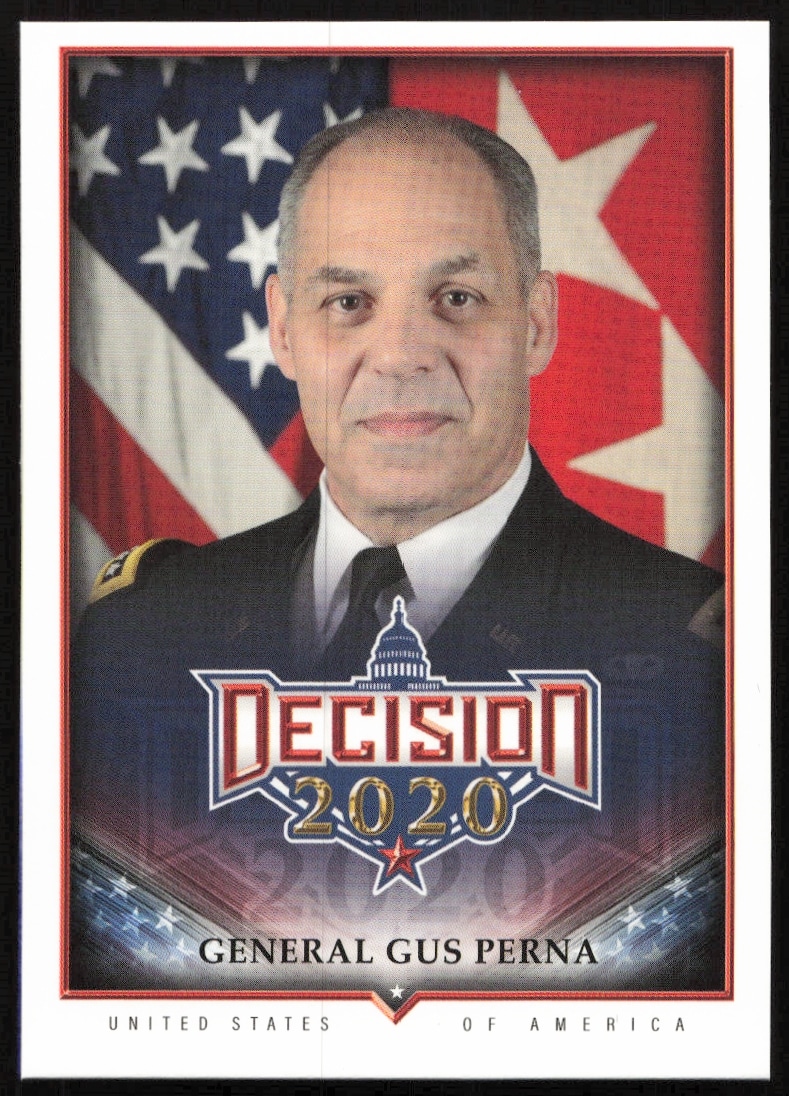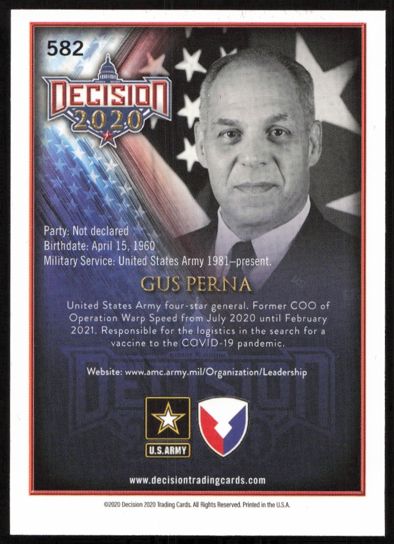 This PoliticalΒ card, from 2020 is part of the Leaf Decision Series 2Β card set. Gus Perna is featured and has a card number of 582.