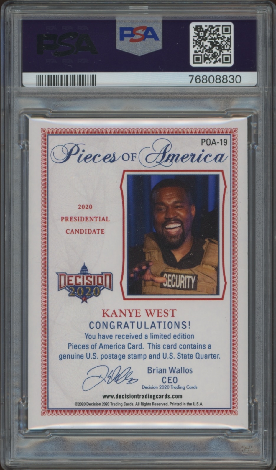 This Political card, from 2020 is part of the Leaf Decision Series 2 card set. Kanye West is featured and has a card number of POA-19. It is graded by PSA and has a numeric grade of 9.