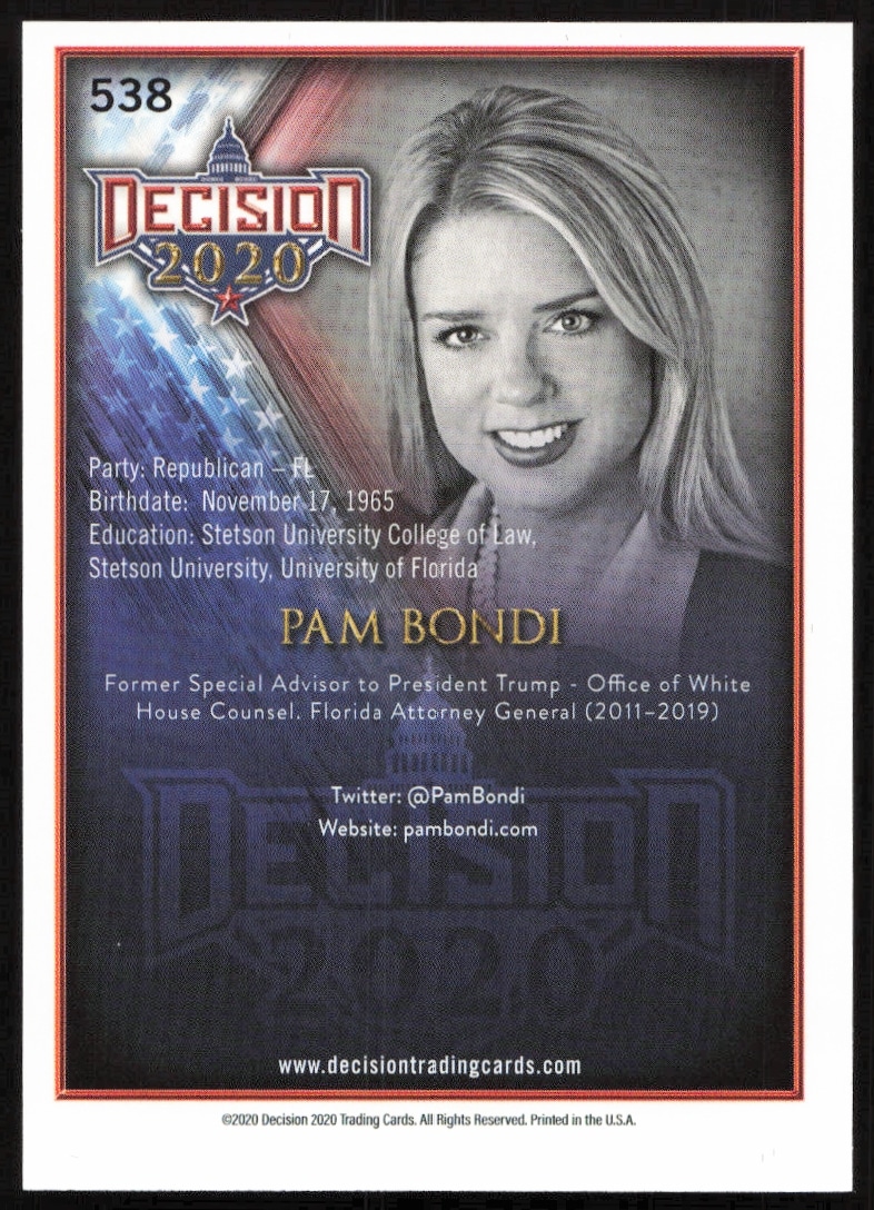 This Political card, from 2020 is part of the Leaf Decision Series 2 card set. Pam Bondi is featured and has a card number of 538.