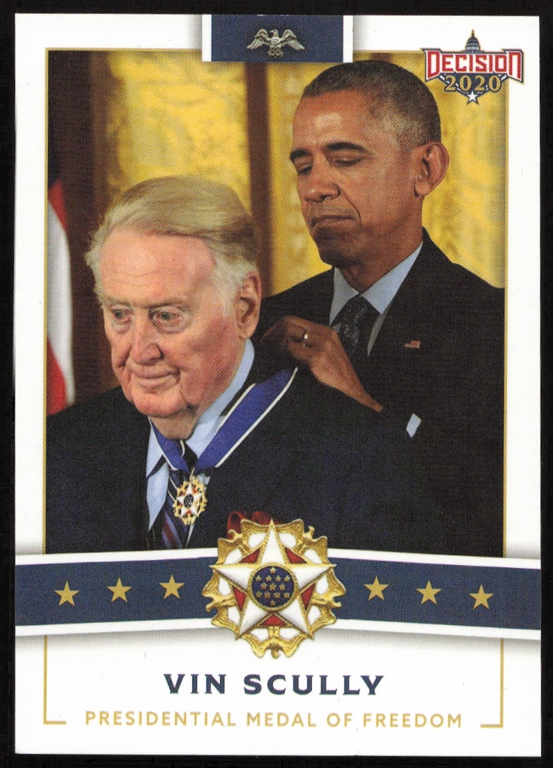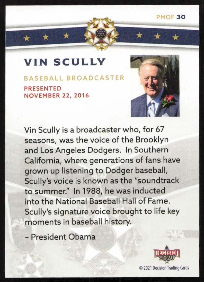 This PoliticalΒ card, from 2020 is part of the Leaf Decision Series 2Β card set. Vin Scully is featured and has a card number of PMOF 30.