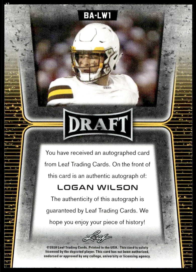 This Football card, from 2020 is part of the Leaf Draft card set. Logan Wilson is featured and has a card number of BA-LW1.