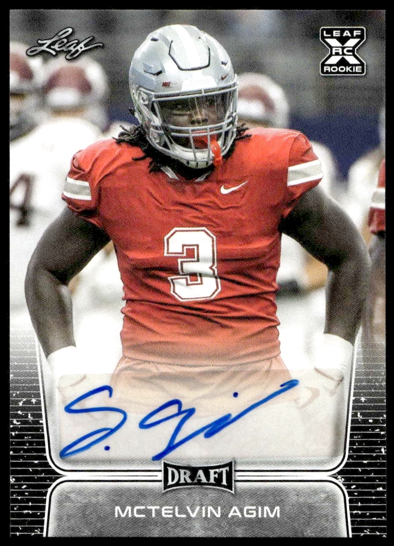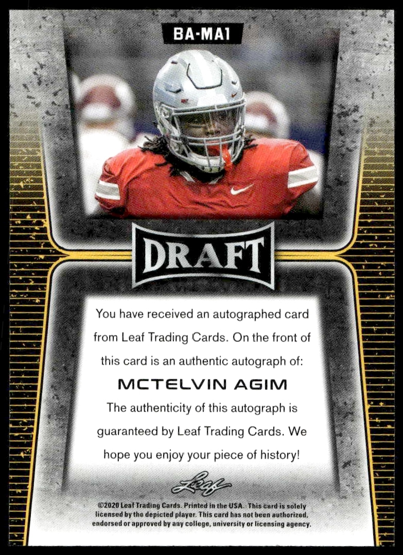 This Football card, from 2020 is part of the Leaf Draft card set. Mctelvin Agim is featured and has a card number of BA-MA1.