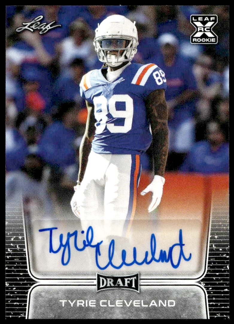 This Football card, from 2020 is part of the Leaf Draft card set. Tyrie Cleveland is featured and has a card number of BA-TC1.
