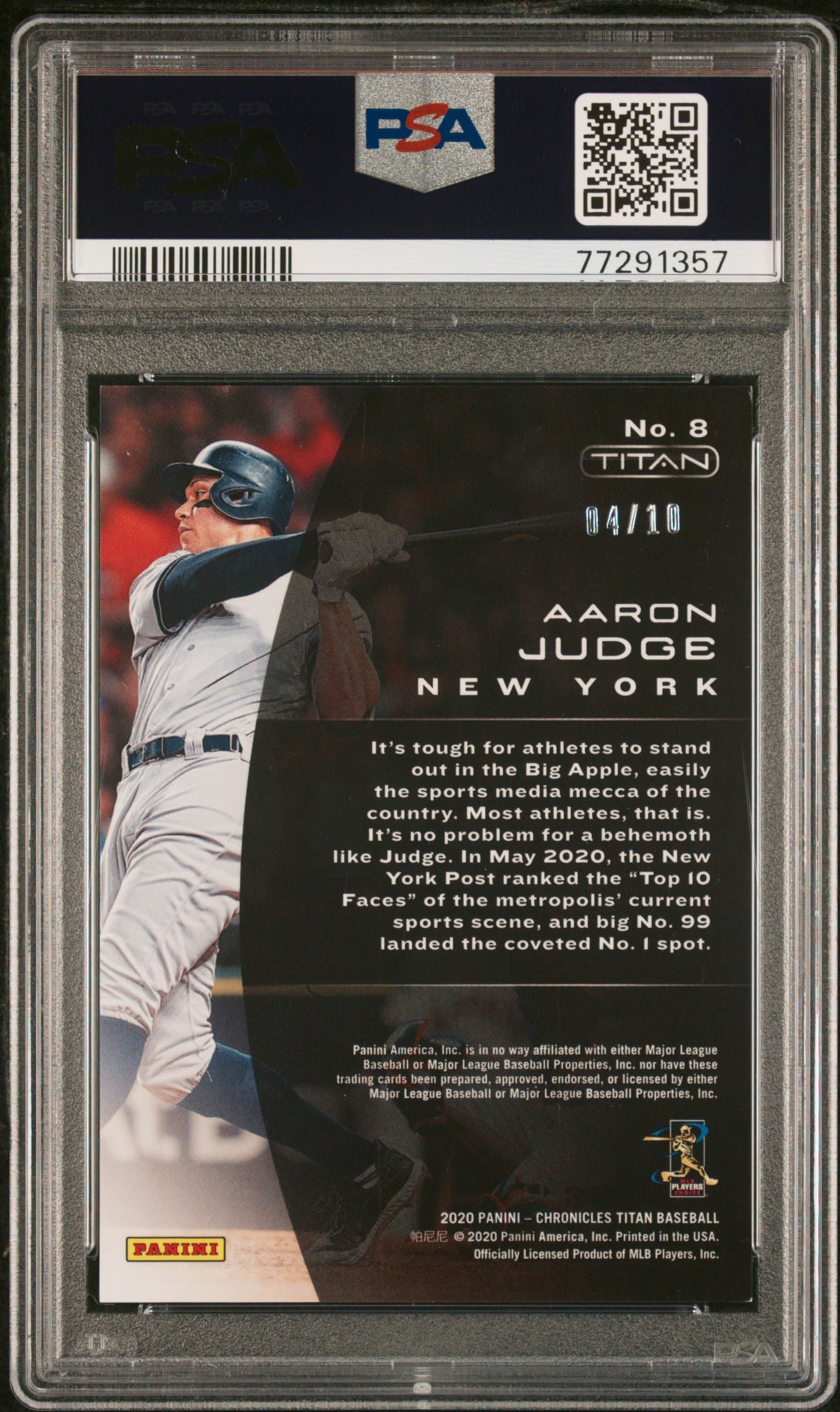 Rare 2020 Panini Chronicles Aaron Judge Titan Gold #8, limited to 10 copies. Graded PSA 9, a must-have for collectors.