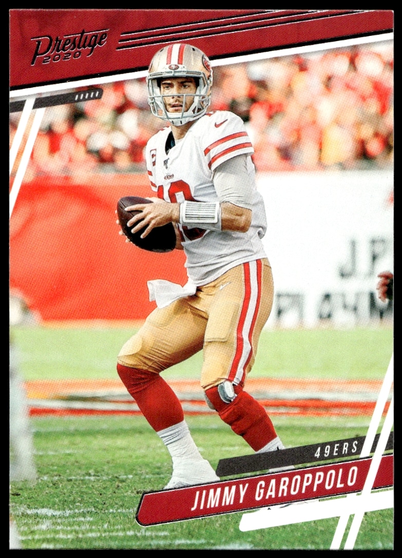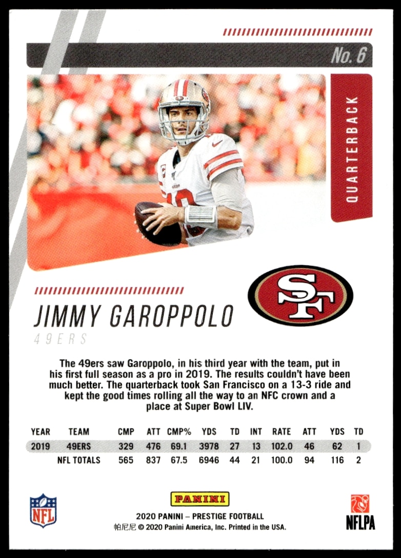 This Football card, from 2020 is part of the Panini Prestige card set. Jimmy Garoppolo is featured and has a card number of 6.