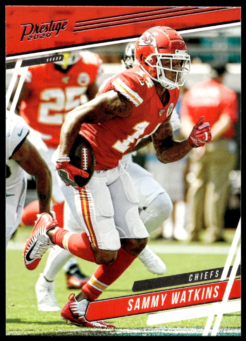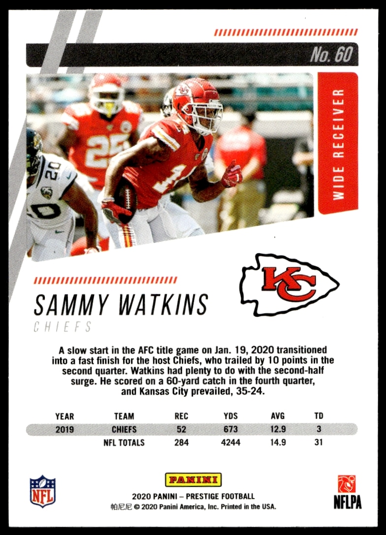 This FootballΒ card, from 2020 is part of the Panini PrestigeΒ card set. Sammy Watkins is featured and has a card number of 60.