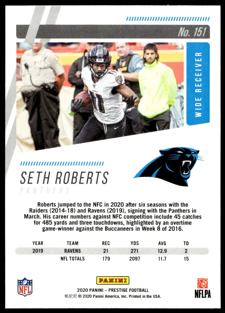 This FootballΒ card, from 2020 is part of the Panini PrestigeΒ card set. Seth Roberts is featured and has a card number of 151.