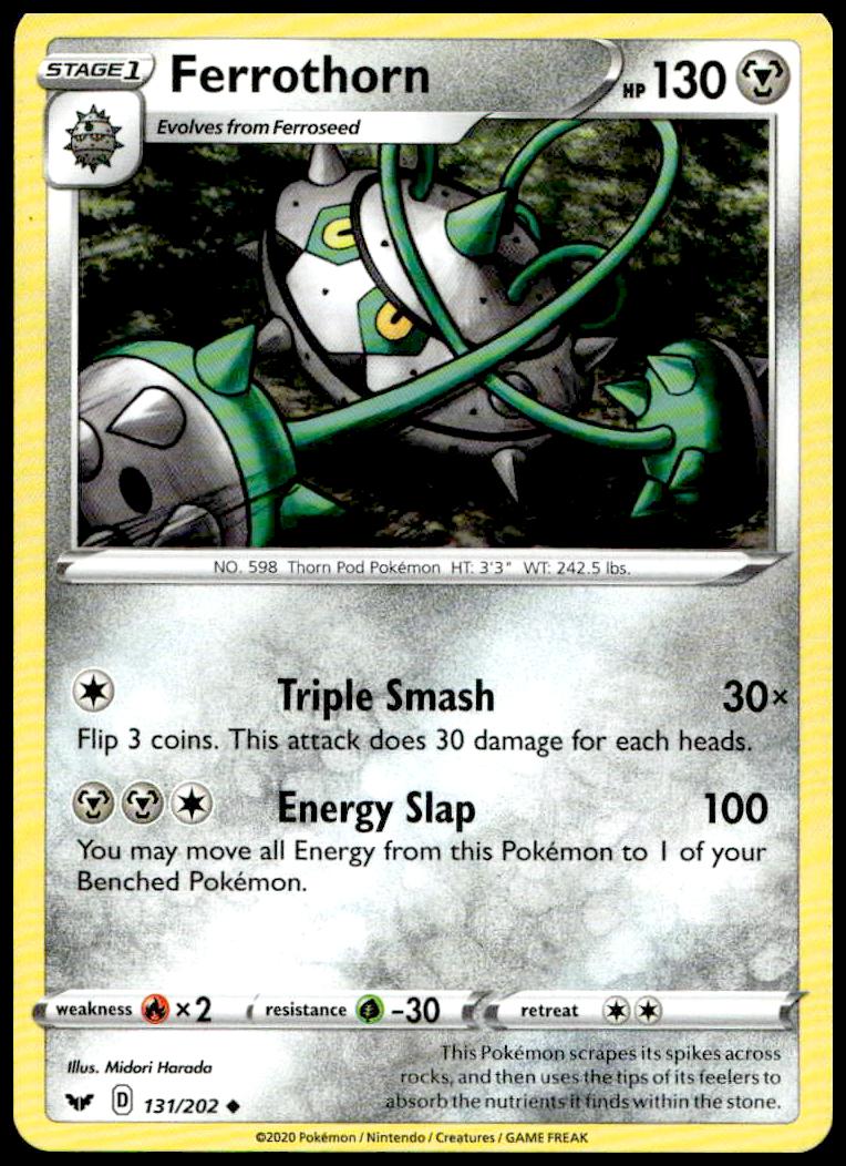 This Pokemon card, from 2020 is part of the Pokémon Sword & Shield – Base Set card set. Ferrothorn is featured and has a card number of 131/202.