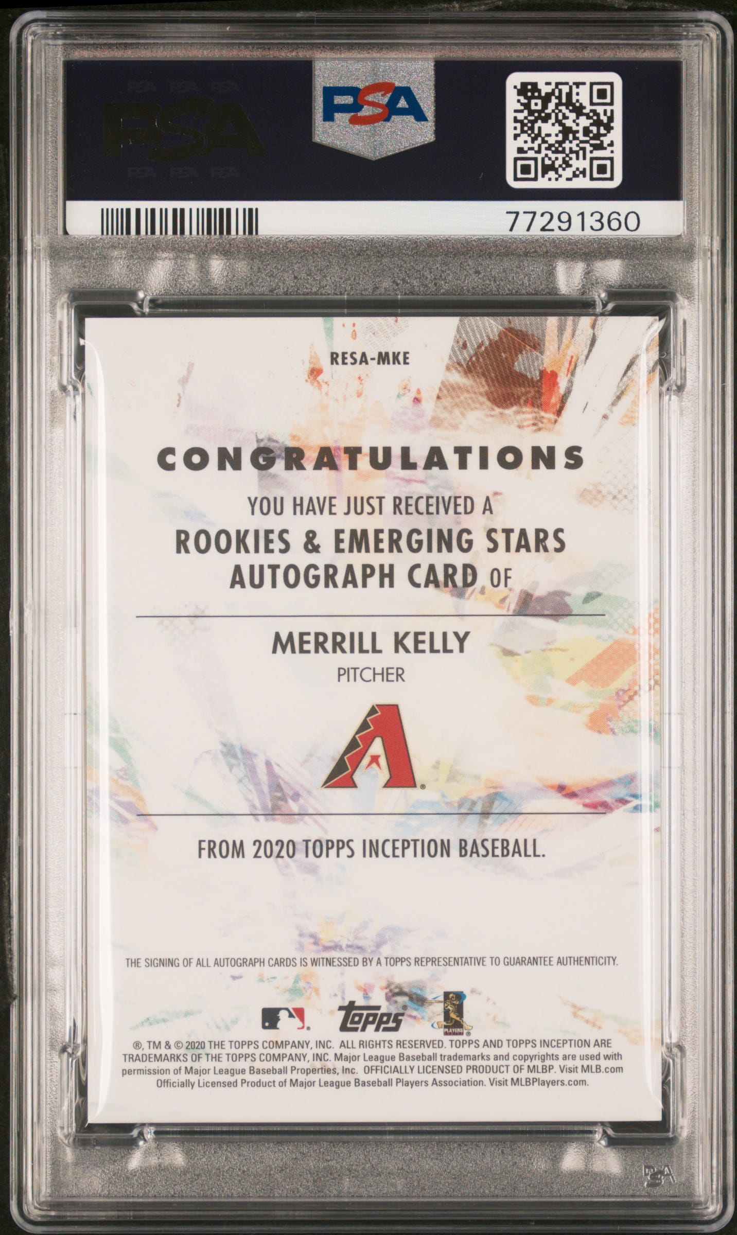 Merrill Kelly’s 2020 Topps Inception autographed rookie card, limited to 75 copies, graded PSA 9. A valuable addition for collectors!