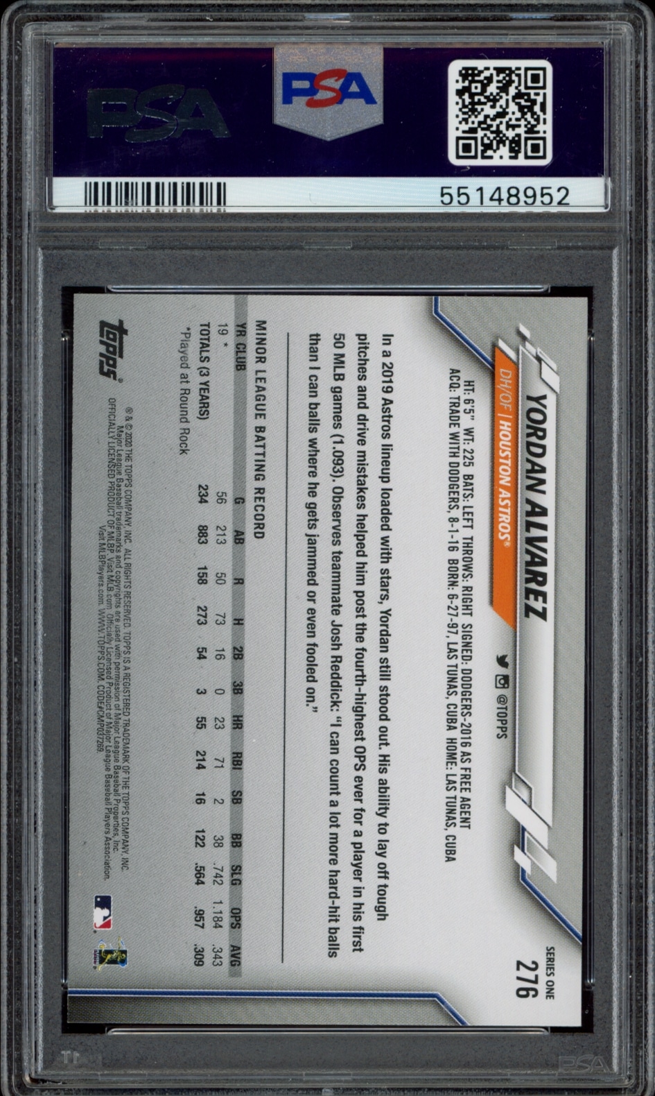 This Baseball card, from 2020 is part of the Topps card set. Yordan Alvarez is featured and has a card number of 276. It is graded by PSA and has a numeric grade of 10.