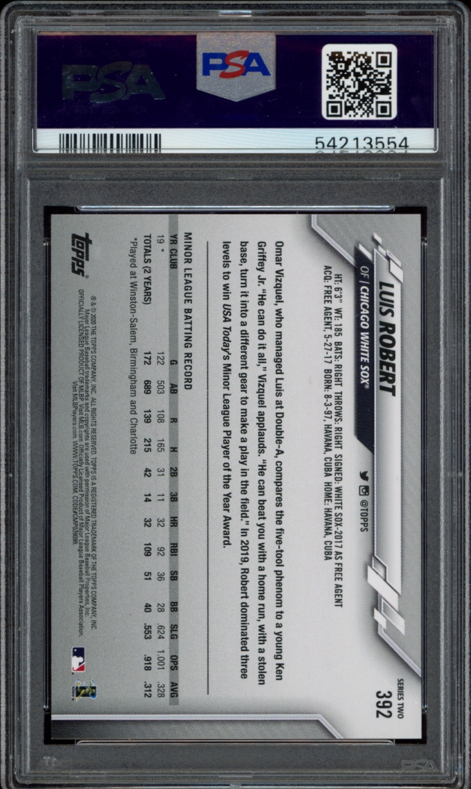 2020 Topps Series 2 Luis Robert #392 graded PSA 10, a must-have for collectors seeking high-quality rookie cards. Elevate your collection today!