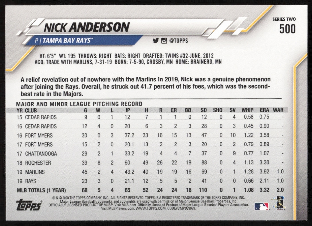 This Baseball card, from 2020 is part of the Topps Series 2 card set. Nick Anderson is featured and has a card number of 500.