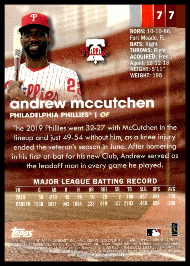 This Baseball card, from 2020 is part of the Topps Stadium Club Chrome card set. Andrew McCutchen is featured and has a card number of 77.