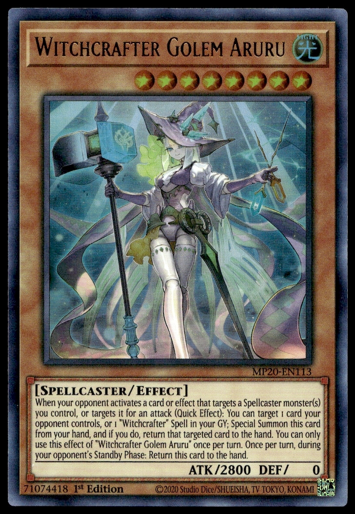 This card, from 2020 is part of the Yu-Gi-Oh! 2020 Mega-Tin: Lost Memories (1st Edition) card set. Witchcrafter Golem Aruru is featured and has a card number of MP20-EN113.