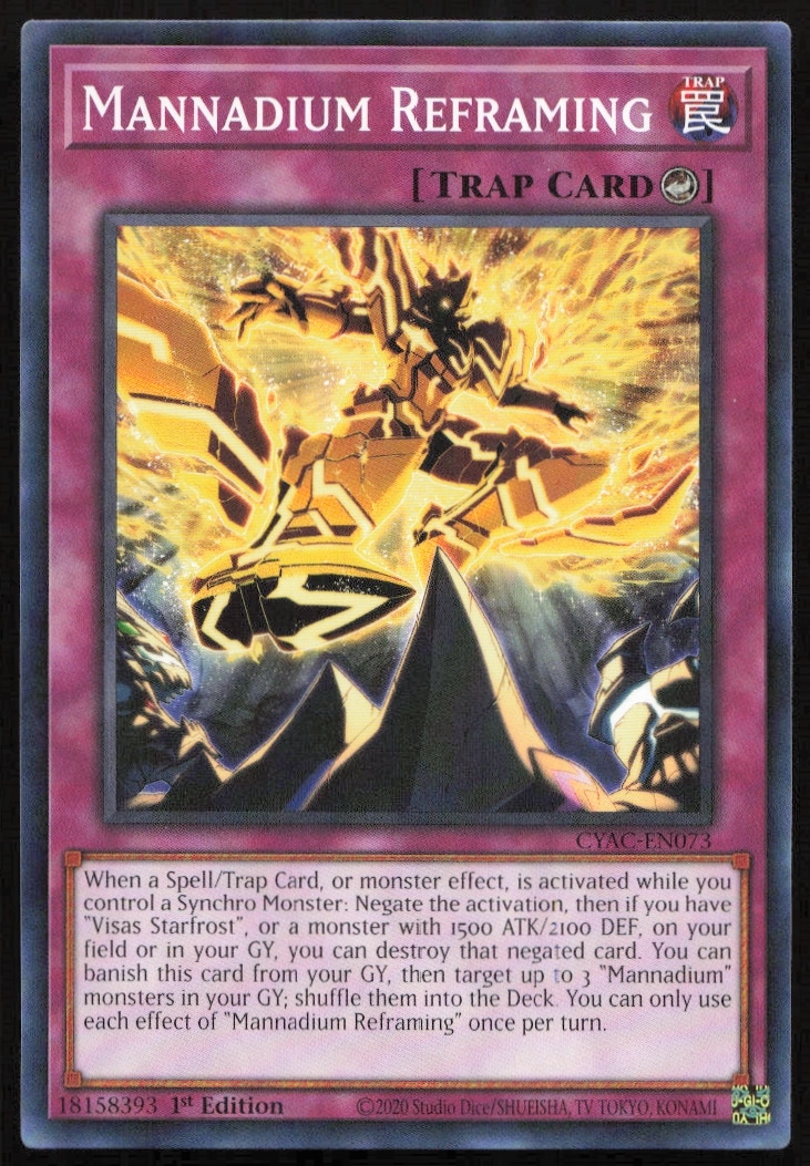 This card, from 2020 is part of the Yu-Gi-Oh! Cyberstorm Access (1st Edition) card set. Mannadium Imaginings is featured and has a card number of CYAC-EN056.