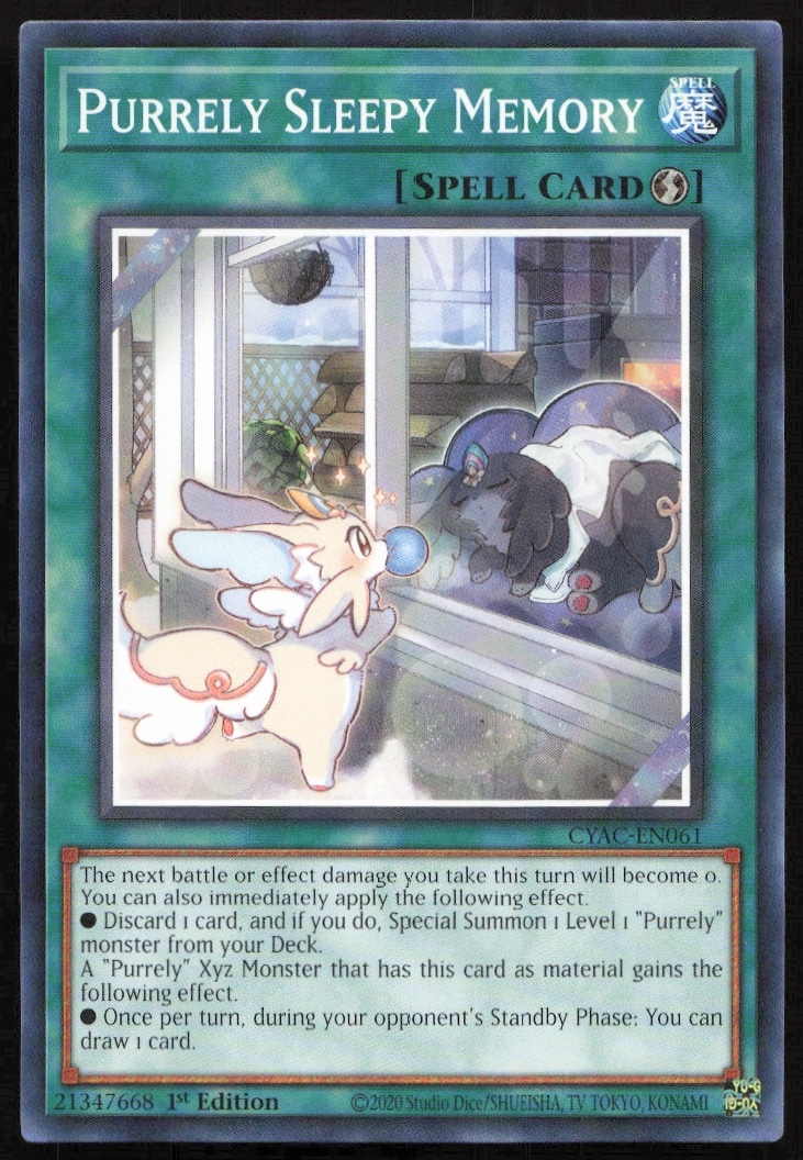 This card, from 2020 is part of the Yu-Gi-Oh! Cyberstorm Access (1st Edition) card set. Purrely Sleepy Memory is featured and has a card number of CYAC-EN061.