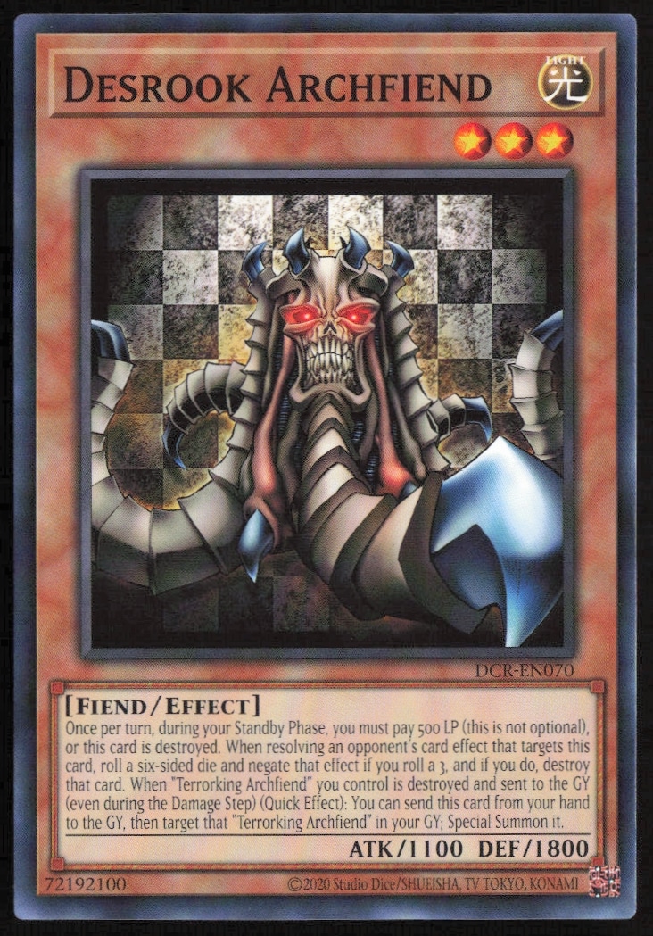 This Yu-Gi-Oh! card, from 2023 is part of the Yu-Gi-Oh! Dark Crisis (25th Anniversary Edition) card set. Desrook Archfiend is featured and has a card number of DCR-EN070.